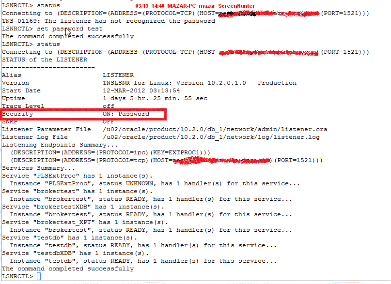 [oracle@vcdb01 ~]$ sqlplus /@testdb SQL*Plus: Release 11.2.0.1.0 Production on Sun Mar 25 10:29:35 2012 Copyright (c) 1982, 2009, Oracle. All rights reserved. ERROR: ORA-01017: invalid username/password; logon denied [oracle@vcdb01 ~]$ mkstore -wrl /u01/app/oracle/product/wallet/ -modifyCredential testdb scott test Oracle Secret Store Tool : Version 11.2.0.1.0 - Production Copyright (c) 2004, 2009, Oracle and/or its affiliates. All rights reserved. Enter wallet password: Modify credential Modify 1 [oracle@vcdb01 ~]$ sqlplus /@testdb SQL*Plus: Release 11.2.0.1.0 Production on Sun Mar 25 10:31:46 2012 Copyright (c) 1982, 2009, Oracle. All rights reserved. Connected to: Oracle Database 11g Enterprise Edition Release 11.2.0.2.0 - 64bit Production With the Partitioning, OLAP, Data Mining and Real Application Testing options SQL>